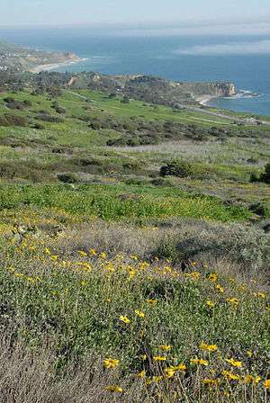 The Palos Verdes Nature Preserve is the largest of the PVPLC's preserves consisting of approximately 1,400 acres (5.7 km2) of rolling hills, steep canyons and rock outcrops, with natural habitat and views of the Pacific Ocean and Santa Catalina Island. The City of Rancho Palos Verdes owns most of the land, which has been acquired over the past twenty years and the Palos Verdes Peninsula Land Conservancy manages the preserve.[2] The preserve is made up of several properties including: Abalone Cove Ecological Reserve, Agua Amarga Reserve, Alta Vicente Reserve, Portuguese Bend Reserve, Forrestal Reserve, Three Sisters Reserve, San Ramon Reserve, Vicente Bluffs Reserve, and Vista Del Norte Reserve.[3]