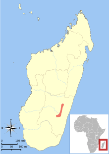 Milne-Edwards' sifaka is endemic to the island of Madagascar off the southeastern coast of Africa. Milne-Edwards' sifaka is found in primary and secondary rainforests on the southeastern part of the island at elevations between 600 and 1,600 m (2,000 and 5,200 ft). Milne-Edwards' sifaka has the southern-most range of the diademed sifakas. The Mangoro and Onive rivers border the northern part of its range and its southern range extends to Andringitra National Park and the Rienana River.[5][12]