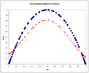 where the learning rate is again taken to be 0.3. The training is performed with one pass through the 100 training points. The rms error on a test set of 100 exemplars is 0.084, smaller than the unnormalized error. Normalization yields accuracy improvement. Typically accuracy with normalized basis functions increases even more over unnormalized functions as input dimensionality increases.