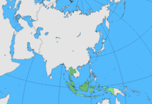 The red-naped trogon is presumed to be a permanent resident or sedentary bird. Sedentary is “commonly used in the special sense of ‘non-migratory,’” and resident is defined as “remaining throughout the year in the area under reference”.[9] At least 4,000 species of bird are regular migrants, which is approximately 40 percentage of the world’s population of birds,[10] however the red-napped trogon is not one of these. It does not migrate, but instead remains in the same location all year round. Red-naped trogons are confined to the Sundaic regions lowlands, also known as Sundaland, with a distribution size of 989,000 km². The Sundaic lowlands is a biogeographical region of South-eastern Asia which encompasses the Sunda shelf, Malay Peninsula of the Asian mainland, and the large islands of Borneo, Java and Sumatra, including their surrounding islands. The eastern boundary of the Sundaic region is the Wallace Line which separates the Indomalaya and Australasia ecotones.