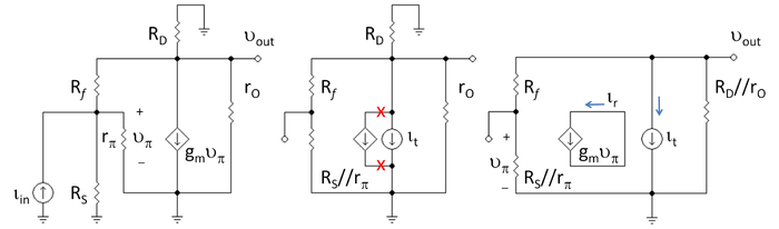 Figure 1 (top right) shows a bipolar amplifier with feedback bias resistor Rf driven by a Norton signal source. Figure 2 (left panel) shows the corresponding small-signal circuit obtained by replacing the transistor with its hybrid-pi model. The objective is to find the return ratio of the dependent current source in this amplifier.[9] To reach the objective, the steps outlined above are followed. Figure 2 (center panel) shows the application of these steps up to Step 4, with the dependent source moved to the left of the inserted source of value it, and the leads targeted for cutting marked with an x. Figure 2 (right panel) shows the circuit set up for calculation of the return ratio T, which is