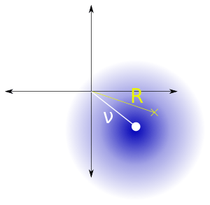 In the 2D plane, pick a fixed point at distance ν from the origin. Generate a distribution of 2D points centered around that point, where the x and y coordinates are chosen independently from a gaussian distribution with standard deviation σ (blue region). If R is the distance from these points to the origin, then R has a Rice distribution.