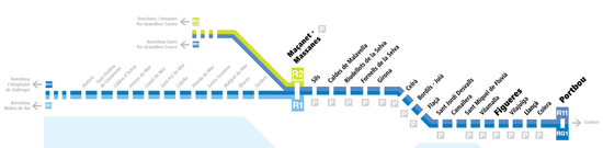 Line RG1 is actually an extension of some trains on Barcelona commuter rail service line R1 which formerly terminated at Maçanet-Massanes.[7] Due to this fact, line RG1's L'Hospitalet de Llobregat–Mataró section, despite not serving as a Girona-centered commuter rail line, but as a Barcelona-centered one, is included as part of the Girona commuter rail service.[32][33] At the beginning, the RG1 did not run on weekends and ran exclusively between L'Hospitalet de Llobregat and Figueres. However, from 20 June 2014 on, some trains travel further north towards Portbou and additional weekend services are offered during the summer season.[29]