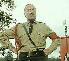 In the television series Jeeves and Wooster, the Black Shorts are portrayed as a tiny group of around a dozen men and teenage boys dressed in Sturmabteilung uniforms only without caps. They also have the same flag colour scheme as the National Socialists and adopt the Sig Rune lightning bolt, which was also adopted by the British Union of Fascists. They comprise the small, but enthusiastic, audience to whom Spode makes loud, dramatic Hitler-like speeches in which he announces bizarre statements of policy, such as giving each citizen at birth a British–made bicycle and umbrella,[3] widening the rails of the entire British railway network, so sheep may stand sideways on trains,[4] banning the import of foreign root-vegetables, and compulsory scientific measurement of all male knees.[5]