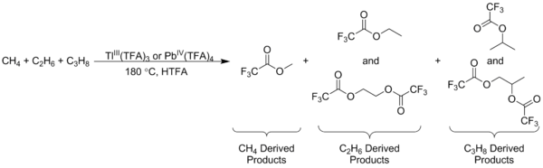 Periana published an article in the multidisciplinary journal Science describing the use of main group trifluoroacetate salts of lead and thallium that convert a natural gas stream (comprising methane, ethane, and propane) to the respective trifluoroacetate esters.[6] It was found that the system readily led to the rapid oxidation of the natural gas stream at 180°C and was capable of reacting with a mixed gas stream or each alkane independently.[7]