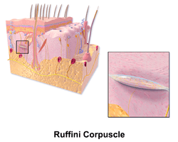Ruffinian endings are located in the deep layers of the skin, and register mechanical deformation within joints, more specifically angle change, with a specificity of up to 2.75 degrees, as well as continuous pressure states. They also act as thermoreceptors that respond for a long time, so in case of deep burn there will be no pain as these receptors will be burned off.[5] Classically regarded as a thermoreceptor, the Ruffinian endings/corpuscle is not actually a thermoreceptor but is rather a mechanoreceptor.[6]