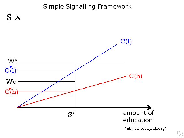The premise for the model is that a person of high ability (h) has a lower cost for obtaining a given level of education than does a person of lower ability (l). Cost can be in terms of monetary, such as tuition, or psychological, stress incurred to obtain the credential.