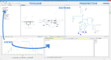 Simantics System Dynamics workbench window contains one or more perspective and perspectives contain different views and editors. Views are used to represent data in different ways. Editors are used for the actual modeling.[7]