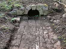 During excavations a drainage culvert was discovered about 20 metres (66 ft) west of Terminus bridge.[30] Work resumed in September and November 2014 to batter and reshape the canal embankments. Excess topsoil was removed and the towpath reinstated on the stretch to the east from Terminus bridge for about 200 metres (660 ft). On the same stretch a retaining wall was discovered in the south embankment continuing for about 100 metres (330 ft), possibly built as a repair to a weak section of canal banking. Vertical infills of white clay have been used along this wall.