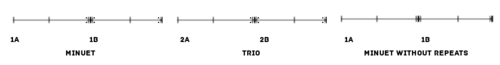 In a trio form each section is a dance movement in binary form (two sub-sections which are each repeated) and a contrasting trio movement also in binary form with repeats. An example is the minuet and trio from the Haydn's Surprise Symphony. The minuet consists of one section (1A) which is repeated and a second section (1B) which is also repeated. The trio section follows the same format (2A repeated and 2B repeated). The complete minuet is then played again at the end of the trio represented as: [(1A–1A–1B–1B) (2A–2A–2B–2B) (1A–1A–1B–1B)]. By convention in the second rendition of the minuet, the sections are not repeated with the scheme [(1A–1A–1B–1B) (2A–2A–2B–2B) (1A–1B)]. The trio may also be referred to as a double or as I/II, such as in Bach's polonaise and double (or Polonaise I/II) from his second orchestral suite and his bouree and double (or Bouree I/II) from his second English Suite for harpsichord.
