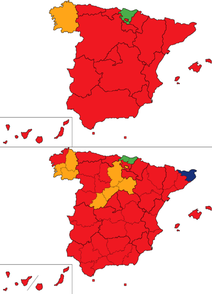 3 × 7 = 21 Ávila, Guadalajara, Huesca, Palencia, Segovia, Soria and Teruel