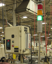 Stack lights (aka: indicator lights, AndOn lights, warning lights, industrial signal lights, tower lights and light towers) are commonly used on equipment in industrial manufacturing and process control environments to provide visual and audible indicators of a machine state or process event to machine operators, technicians, production managers and factory personnel.