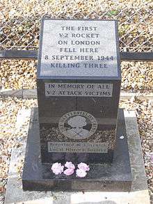 At 6.43pm on Friday 8 September 1944, a V-2 missile (Aggregat 4 in German) launched from Wassenaar in Holland landed in Staveley Road, near the junction with Burlington Lane, killing three people (including a three-year-old girl), and injuring nineteen people.[1] The crater was thirty feet deep. The missile had taken seven minutes to reach Chiswick from Holland, travelling at around 3,000mph. This is regarded as the world's first recognised ballistic rocket attack, although another V-2 had previously landed in the outskirts of Paris earlier in the morning. Sixteen seconds after the V-2 attack occurred in Chiswick, another V-2 landed in Epping Forest harmlessly; another V-2 landed in London that day.