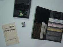 The Master Library Module shown removed from its socket in the back of the calculator. Magnetic card storage folio also shown.