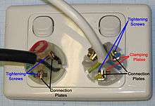 Two types of screw terminals showing a significant development in design. Basic, with the wires held between the screws and the terminals (left) and with the wires held, reversely, between the metal (clamping) plates and the rear of the terminals (right).