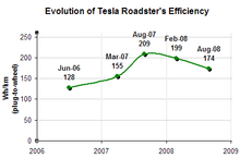 165. Simpson, Andrew (2007-09-24). "Where the Rubber Meets the Road". Retrieved 2008-02-22. Mr. Simpson confirmed via email that "We do not quote station-to-wheel efficiency, but we do quote plug-to-wheel efficiency which includes all energy use downstream of the charging plug. For the most recent 221 mi (356 km) range test, our plug-to-wheel efficiency was 336 Wh/mi".