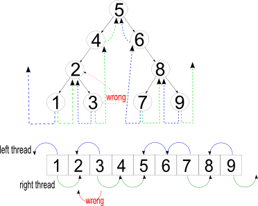 "A binary tree is threaded by making all right child pointers that would normally be null point to the inorder successor of the node (if it exists), and all left child pointers that would normally be null point to the inorder predecessor of the node."[3]