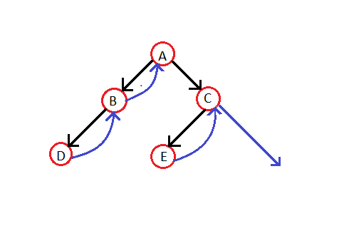 | step-4 | 'B' certainly has a left child but its already in our list of visited nodes. So, we print 'B'. Then we check for its right child but it doesn't exist. So, we make its threaded node (i.e. 'A') as our current node in consideration. | B D | D B | |