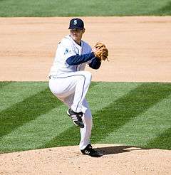 Horacio Ramírez pitching from the stretch, at the time of pitch. At this point he has raised his right knee but has not begun to move toward home plate.