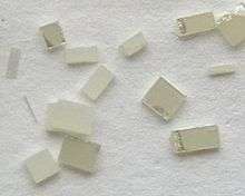 Synthetic single crystals of TiO2, ca. 2–3 mm in size, cut from a larger plate.
