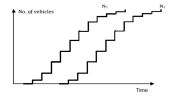 A cumulative vehicle count curve, the N-curve, shows the cumulative number of vehicles that pass a certain location x by time t, measured from the passage of some reference vehicle.[9] This curve can be plotted if the arrival times are known for individual vehicles approaching a location x, and the departure times are also known as they leave location x. Obtaining these arrival and departure times could involve data collection: for example, one could set two point sensors at locations X1 and X2, and count the number of vehicles that pass this segment while also recording the time each vehicle arrives at X1 and departs from X2. The resulting plot is a pair of cumulative curves where the vertical axis (N) represents the cumulative number of vehicles that pass the two points: X1 and X2, and the horizontal axis (t) represents the elapsed time from X1 and X2.