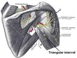 The triangular interval (also known as the lateral triangular space,[1] lower triangular space,[2] and triceps hiatus) is a space found in the axilla.