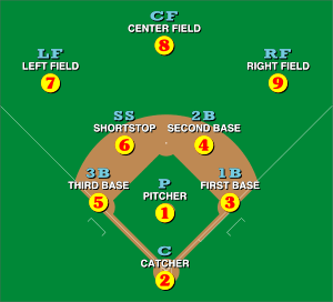 Asterisks (*) denote which players recorded outs, per standard baseball positions.