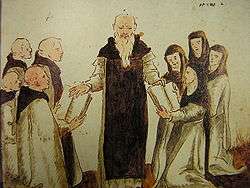 A postscript by Carthusian librarians states that the book had been presented by one Brother Beroaldus to cardinal Maffeo Barberini, who would later become Pope Urban VIII (1623–44). A further covering note suggests that the images were by the French seer Nostradamus (1503–66), and had been sent to Rome by his son César de Nostredame as a gift. There is, however, absolutely no contemporary evidence that Nostradamus himself was either a painter or the author of the work, whose contents in fact date from several centuries before his time—nor, indeed, that he had ever heard of it, given that it did not finally appear in print until after his death.[4] The postscript is in fact dated '1629', and the covering note (not in Nostradamus's hand) from which the Nostradamian title derives cannot, on the basis of its contents, date from earlier than 1689 - though an internal note does refer to a source dated 1343.[5]