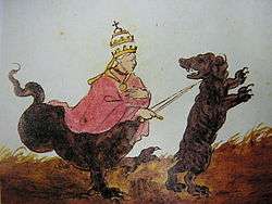 The origin of the work is clearly the fourteenth century Vaticinia de Summis Pontificibus, in which most of the images (including Image 23 opposite) are to be found. By way of example, its Image 12 corresponds to the latter's Image 9, Image 18 to 15, Image 23 to 20, Image 24 to 21 and Image 29 to 26 (note, too, the similarity of sequence).[10] A work similar to this is Marston MS 225, which can be found in the manuscript and rare-book library of Yale University, in New Haven, Connecticut, USA.[11] This manuscript comes from the German areas of Bavaria and Bohemia, probably from within the courts of emperor Frederick III and Maximilian I.