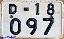 Vehicle registration plates (Russian: Регистрационные знаки транспортных средств, Registracionny'e znaki transportny'kh sredstv,[1] lit. "Registration Plates of Vehicles") are used in the USSR for registrations of automobiles, motorcycles, heavy machinery, special-use vehicles as well as construction equipment, military vehicles and trailers. Every vehicle registration plate consists of a unique registration mark (also known as a registration number) embossed on a metal plate or a plate made of other materials. All vehicles are required to display the plates on the front side and backside, with the exception of trailers and motorcycles, which are only required to display one on the backside.