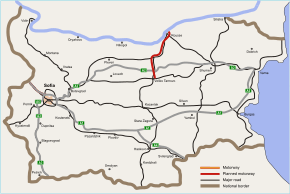The Veliko Tarnovo–Ruse motorway (Bulgarian: Автомагистрала „Велико Търново–Русе“, Avtomagistrala "Veliko Tarnovo–Ruse") is a planned motorway in Northern Bulgaria, that will link Veliko Tarnovo and Ruse, at the Danube border crossing to Romania.[1] It will span for approximately 118 kilometers (73 mi), superseding the existing major road 5. Along with Hemus motorway (A2), Veliko Tarnovo–Ruse motorway aims to provide motorway connection between Sofia and Bucharest, the capitals of Bulgaria and Romania. Also it follows the route of European route E85 and Pan-European Corridor IX. In March 2015, a tender for conceptual design was announced.[2]