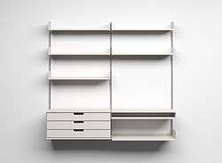 Vitsœ's main product, the 606 Universal Shelving System was designed by Dieter Rams, in 1960. It is a modular system that can be adjusted and extended to individual needs. It is part of the collection of The Museum of Modern Art in New York City. Over time Dieter Rams has made various improvements and additions to the system. The system is based on vertical posts having shelves, cabinets, panels and desks hanging onto it. The system can be wall-mounted, semi wall-mounted which has the system carry its own weight and compressed between the floor and ceiling. If used in a compressed way, shelves can be added on both sides. The system features two distinct segment widths of 65.5 cm and 90 cm and height increments of 7 cm. Due to the way of mounting, shelves can be mounted either way up and even be mounted on the side to feature as a panel for magnets. Similarly the small desk shelf can be hung either way depending on the preferred desk setup. The system also features accessories like drawer dividers and cable conduits. The system is available in off-white, black and silver and can additionally feature beech tops.[4]