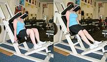 The leg press is performed while seated by pushing a weight away from the body with the feet. It is a compound exercise that also involves the glutes and, to a lesser extent, the hamstrings and the calves. Overloading the machine can result in serious injury if the sled moves uncontrollably towards the trainer.[3]