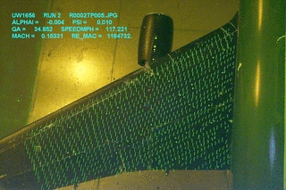 Fluorescent mini-tufts attached to a wing in the Kirsten Wind Tunnel showing air flow direction and separation. Angle of attack ~ 12 degrees, speed ~120 Mph.